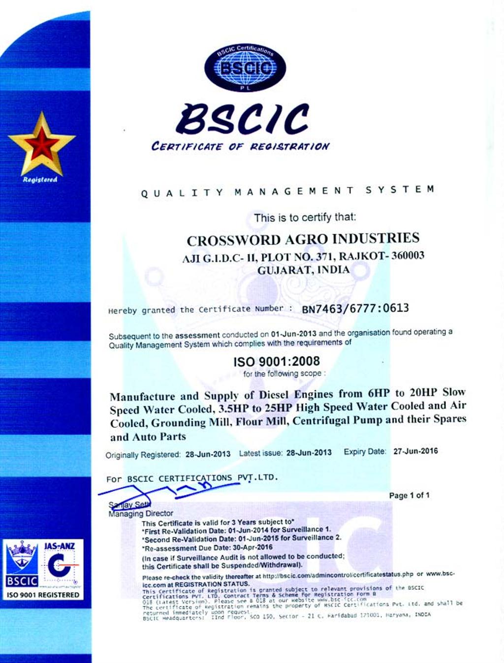 Crossword Agro Industries itself is a synonym of “QUALITY”. The main reason for the success of Crossword Agro Industries is its quality and customer satisfaction. In Crossword Agro Industries all the goods , like Diesel Engine and its Spare Parts more specifically (ListerType Diese Engine and Petter Type Diesel Engine) , Corn Grinding Mill and its Spare Parts, Rice Huller , Centrifugal water pump and its Spare Parts , Pumping sets , Generating Set and Flour Mills are manufactured with an ISO certificate 9001:2008. Crossword Agro Industries is also a STAR EXPORT HOUSE . And Below are some more certificates which makes us one of the leading manufacturer of Diesel Engines , Grinding mills and Centrifugal Pump. These Certificates tells , “Who We Are” and also differentiate us from the mass.